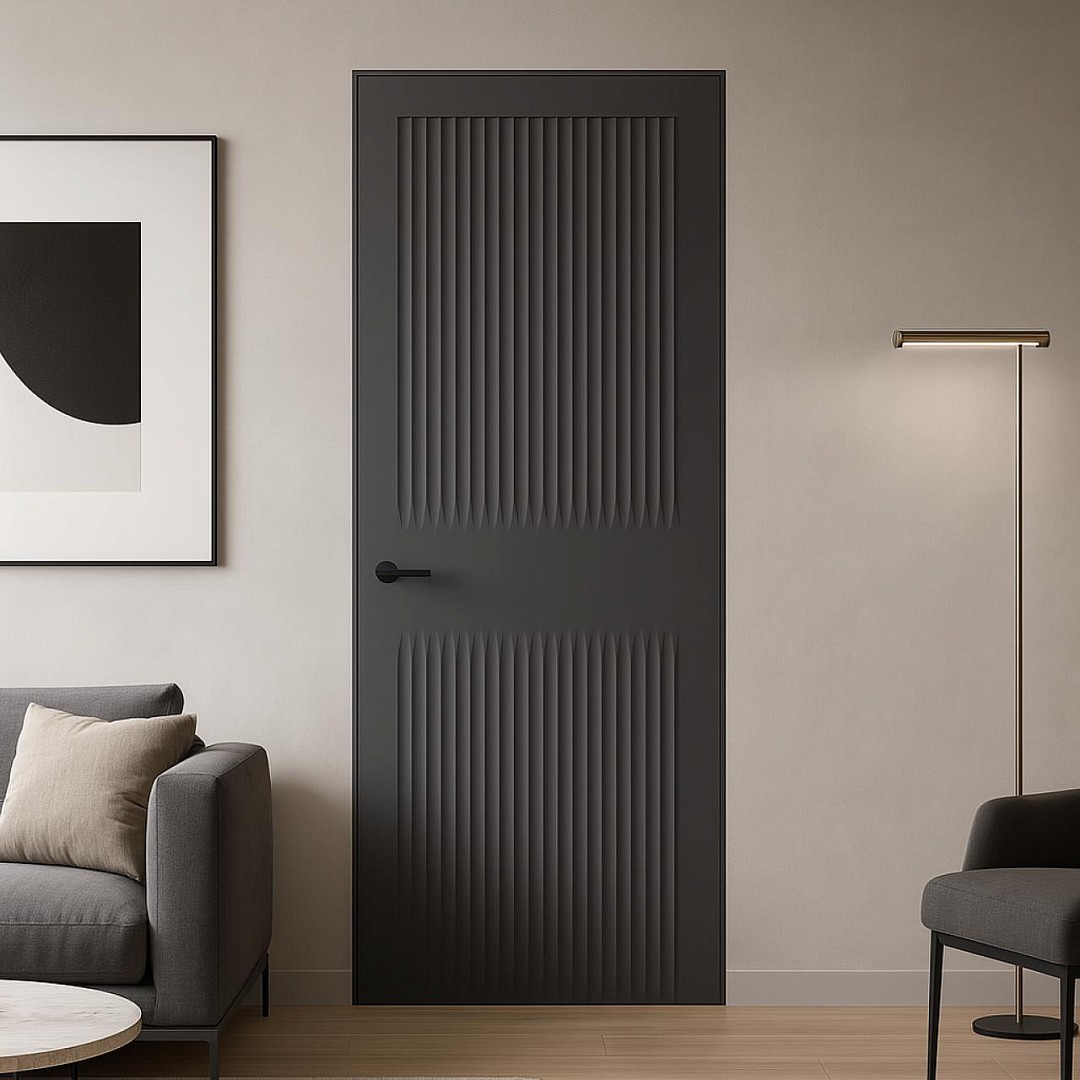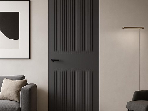 <p>Серия интерьерных дверей, в которой архитектурная строгость сочетается с природной пластикой и минималистичной выразительностью. Главный акцент — вертикальные или волнообразные рельефы, задающие тактильный ритм и графику. Чистые полотна без декора и филёнок, чёткая симметрия и современные форматы исполнения (скрытый короб, компланарный наличник) делают двери актуальными для современных архитектурных пространств.
